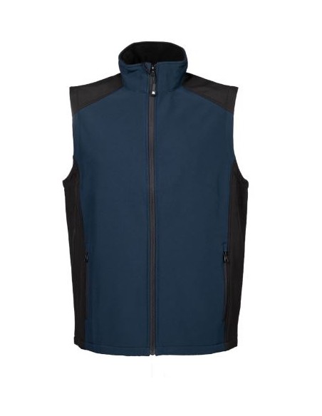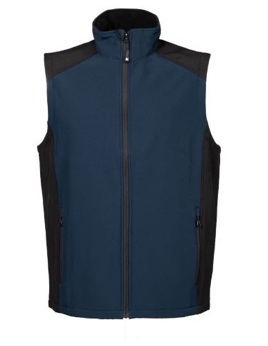 Gilet bicolore in soft shell a due strati impermeabile interno in pile antipilling. Cerniere nastrate. Spalle e fianchi in contrasto. Tessuto a protezione del mento con stampa rifrangente. Nastro di rinforzo interno collo con gancio appendiabito. Due tasche esterne con zip. Polsini in tessuto elastico. Tessuto 100% polyester stretch.