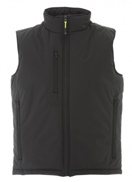Gilet in polyestere pongee. Spalmatura in pvc impermeabile. Imbottitura e fodera in polyestere. Cerniere nastrate. Una tasca con zip sul petto. Due ampie tasche con zip. Elastico antivento nel giromanica.