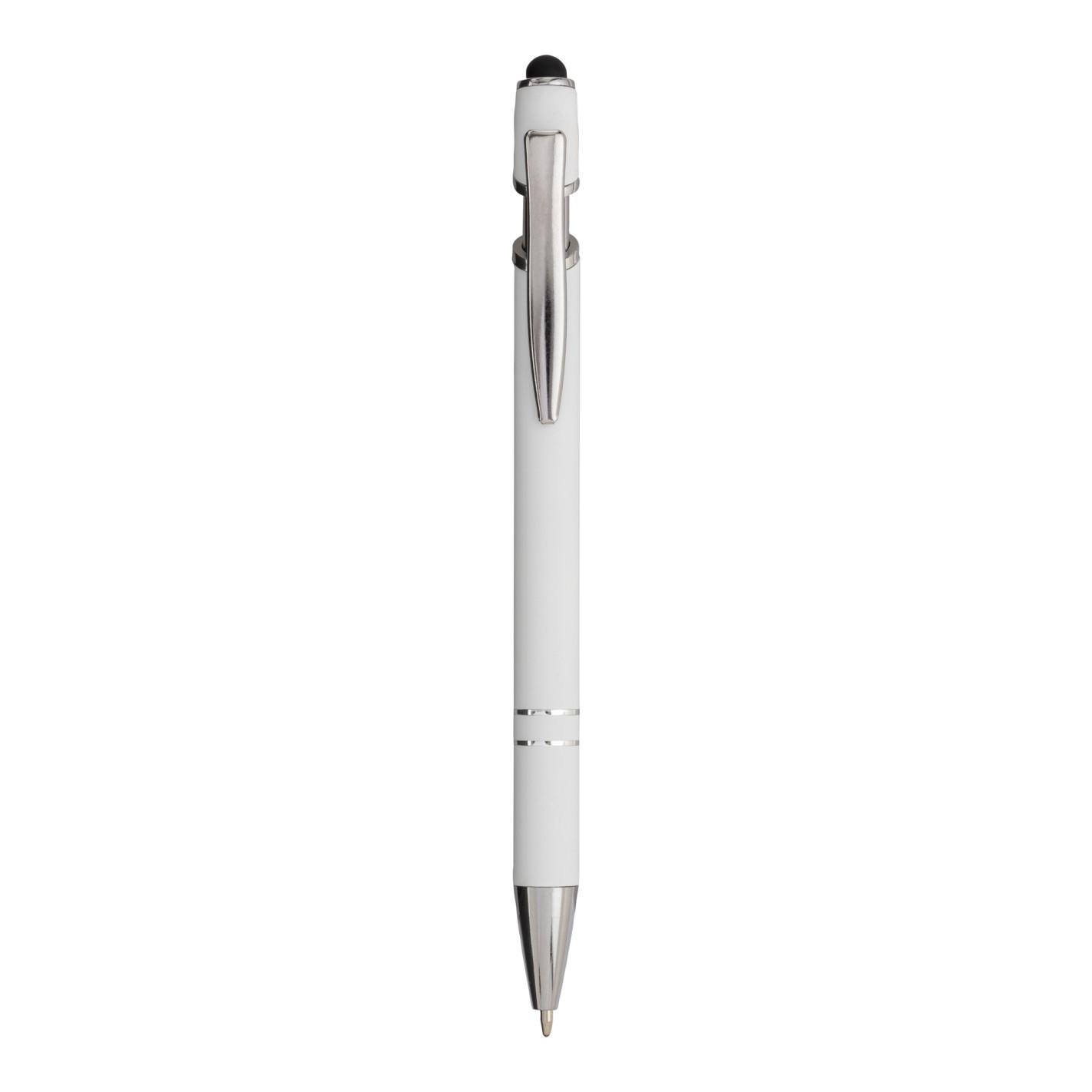 Penna a scatto in alluminio gommato, con gommino per touch screen e clip in metallo e particolari cromati