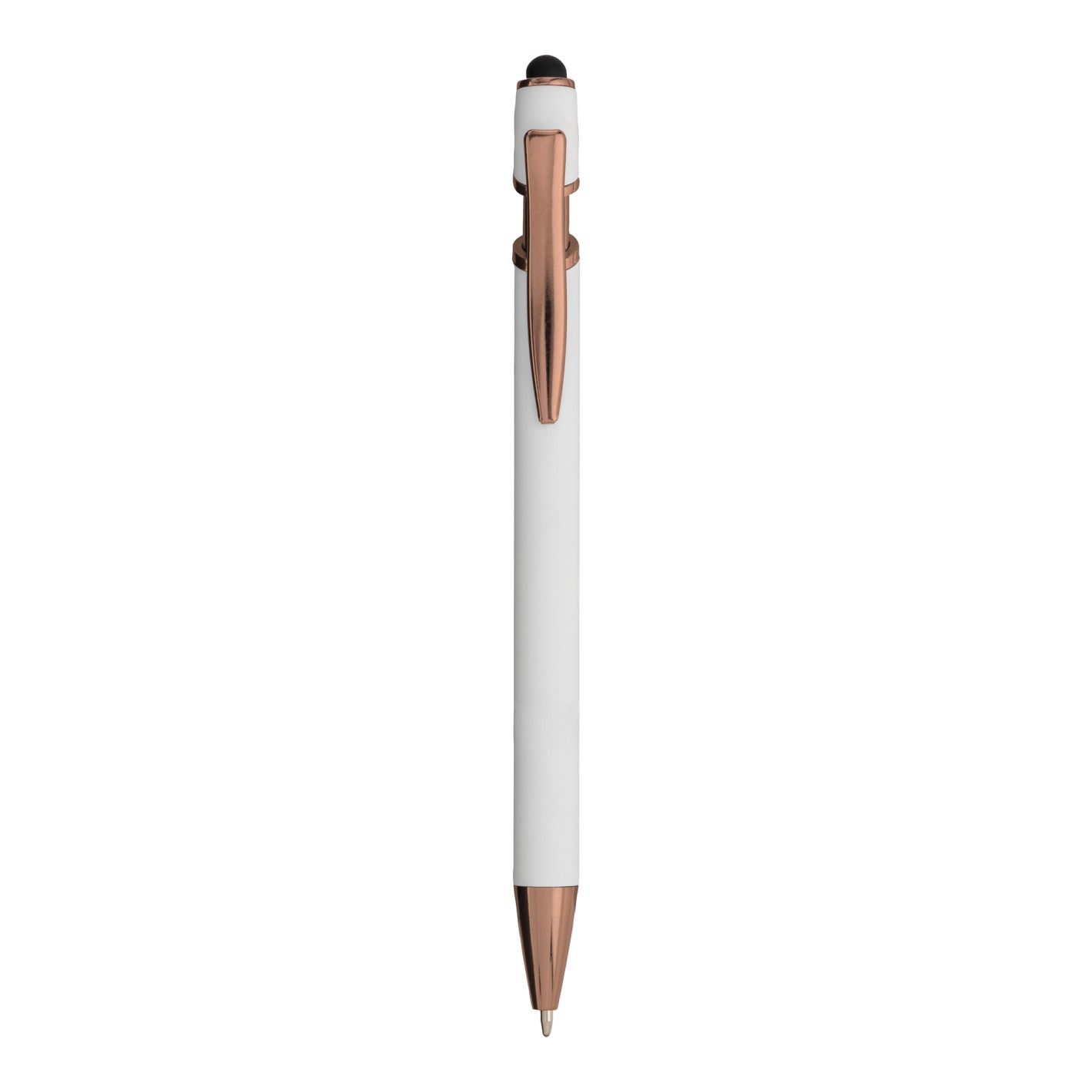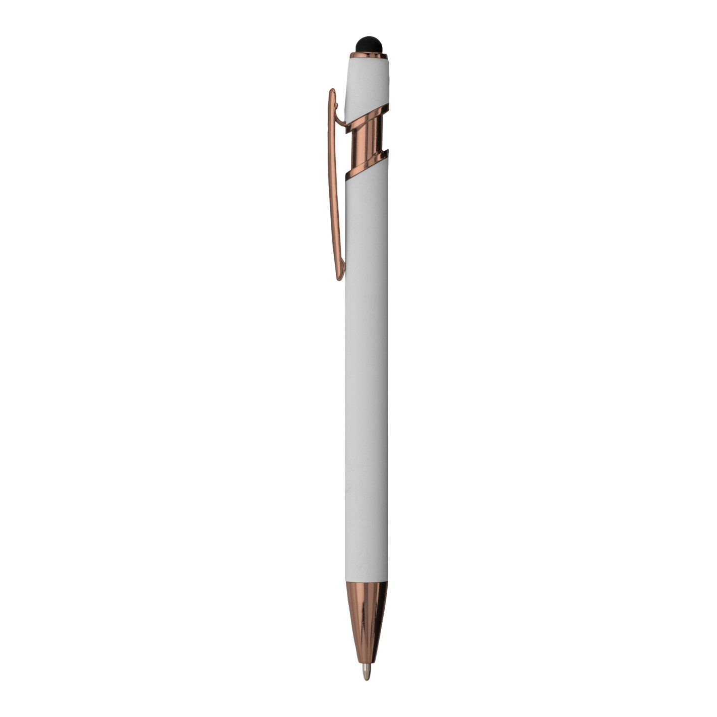 Penna a scatto in alluminio gommato con gommino per touch screen, clip in metallo e finiture color golden rose.