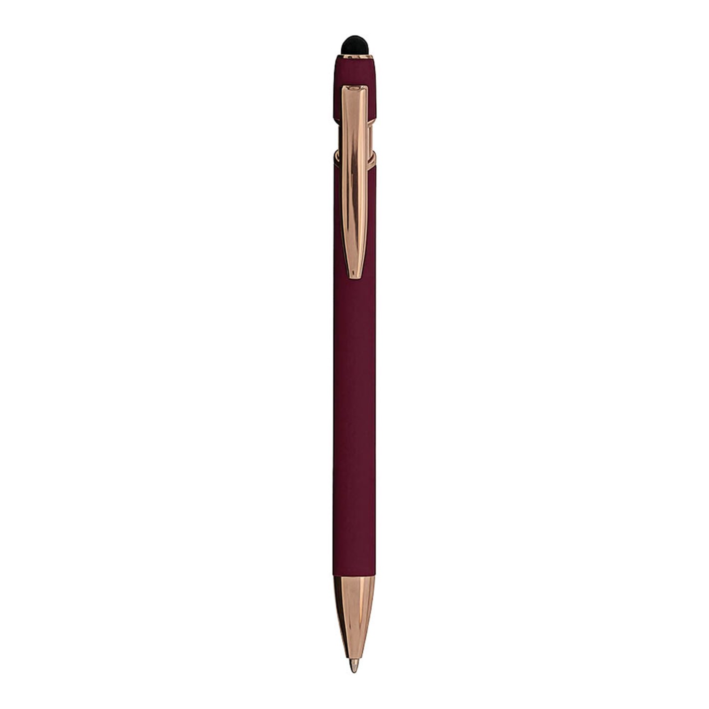 Penna a scatto in alluminio gommato con gommino per touch screen, clip in metallo e finiture color golden rose.