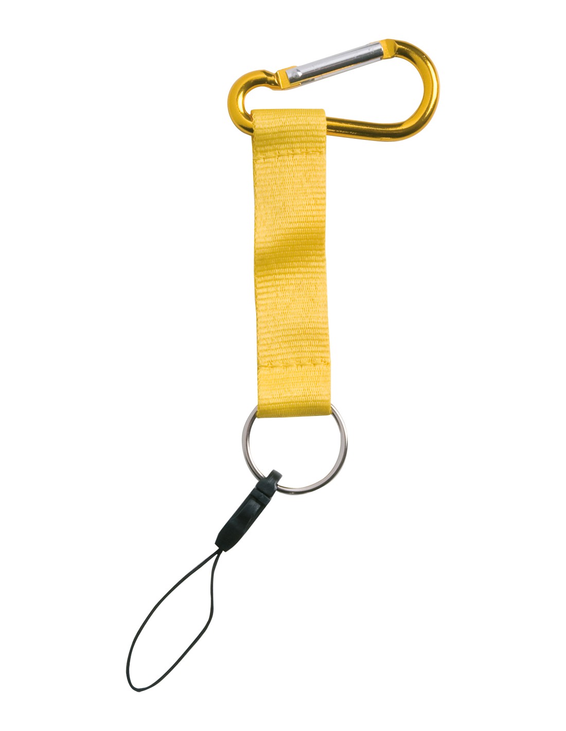 - Portachiavi con moschettone di metallo in tinta e con gancio portacellulare
