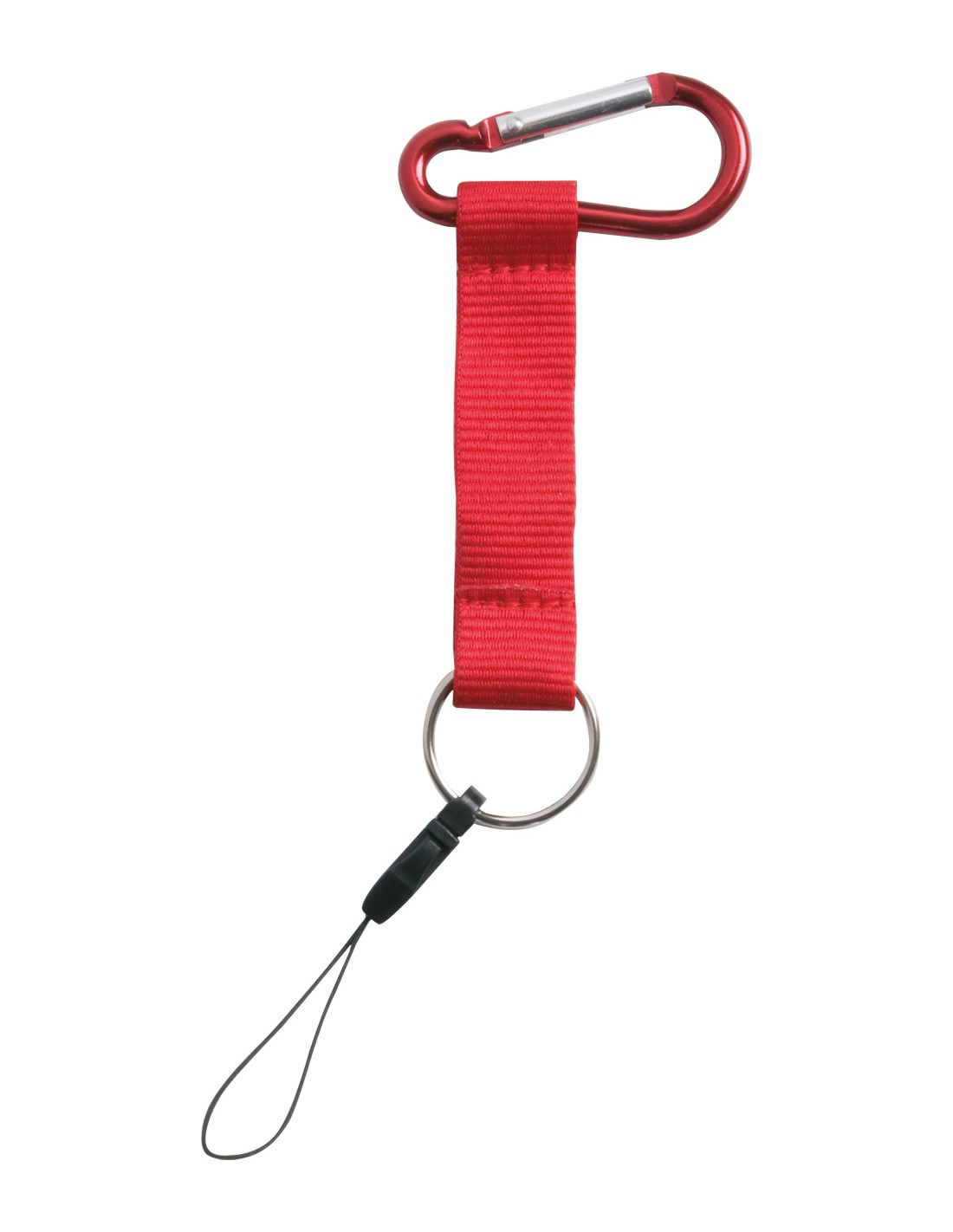 - Portachiavi con moschettone di metallo in tinta e con gancio portacellulare